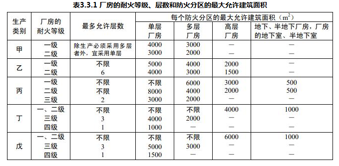厂房的耐火等级、层数和每个防火分区的最大允许建筑面积除本规范另有规定者外,应符合表3.3.1的规定。