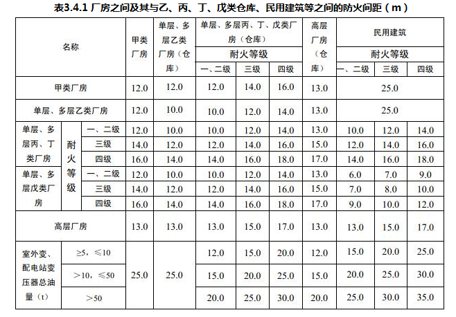 除本规范另有规定者外,厂房之间及其与乙、丙、丁、戊类仓库、民用建筑等之间的防火间距不应小于表3.4.1的规定。