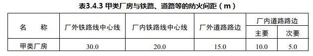 散发可燃气体、可燃蒸气的甲类厂房与铁路、道路等的防火间距不应小于表3.4.3的规定,但甲类厂房所属厂内铁路装卸线当有安全措施时,其间距可不受表3.4.3规定的限制。