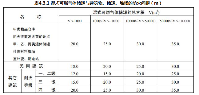 湿式可燃气体储罐与建筑物、储罐、堆场的防火间距不应小于表4.3.1的规定;