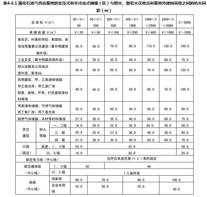 液化石油气供应基地的全压式和半冷冻式储罐或罐区与明火、散发火花地点和基地外建筑物之间的防火间距,不应小于表4.4.1的规定。