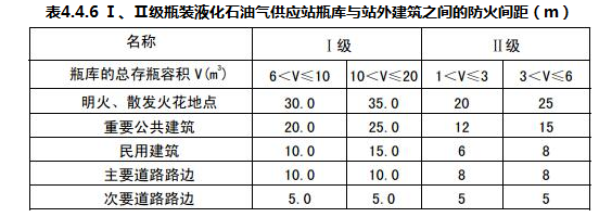 Ⅰ、Ⅱ级瓶装液化石油气供应站瓶库与站外建筑之间的防火间距不应小于表4.4.6的规定。