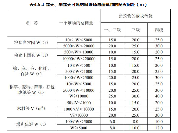露天、半露天可燃材料堆场与建筑物的防火间距不应小于表4.5.1的规定。