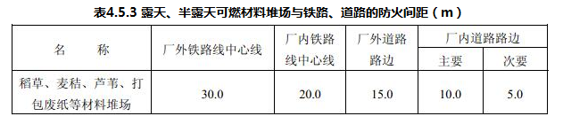 露天、半露天可燃材料堆场与铁路、道路的防火间距不应小于表4.5.3的规定。