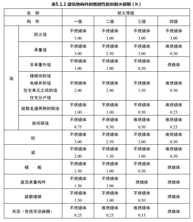 民用建筑的耐火等级应分为一、二、三、四级。除本规范另有规定者外,不同耐火等级建筑物相应构件的燃烧性能和耐火极限不应低于表5.1.1的规定。