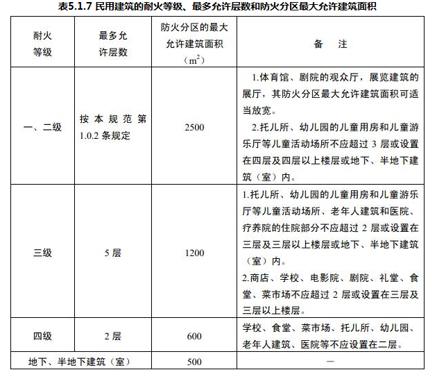 民用建筑的耐火等级、最多允许层数和防火分区最大允许建筑面积应符合表5.1.7的规定。