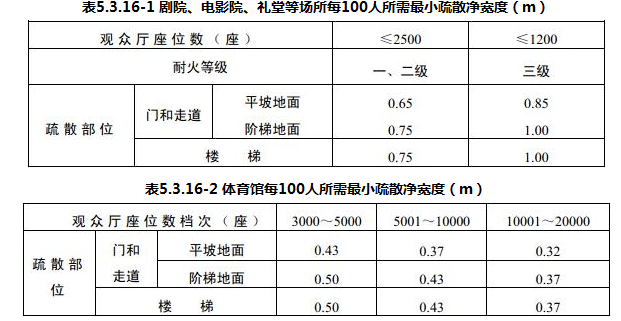 剧院、电影院、礼堂等场所供观众疏散的所有内门、外门、楼梯和走道的各自总宽度,应按表5.3.16-1的规定计算确定;