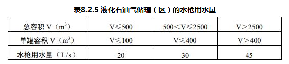 可燃材料堆场、可燃气体储罐(区)的室外消防用水量,不应小于表8.2.3 的规定。