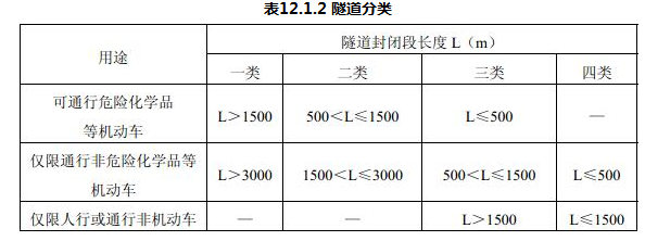 单孔和双孔隧道应按其封闭段长度及交通情况分为一、二、三、四类,并应符合表12.1.2的规定。