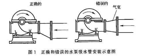 消防泵组吸水管安装若有倒坡现象则会产生气囊,采用大小头与消防泵组吸水口连接,如果是同心大小头,则在吸水管上部有倒坡现象存在。异径管的大小头上部会存留从水中析出的气体,因此应采用偏心异径管,且要求吸水管的上部保持平接(见图1) 。