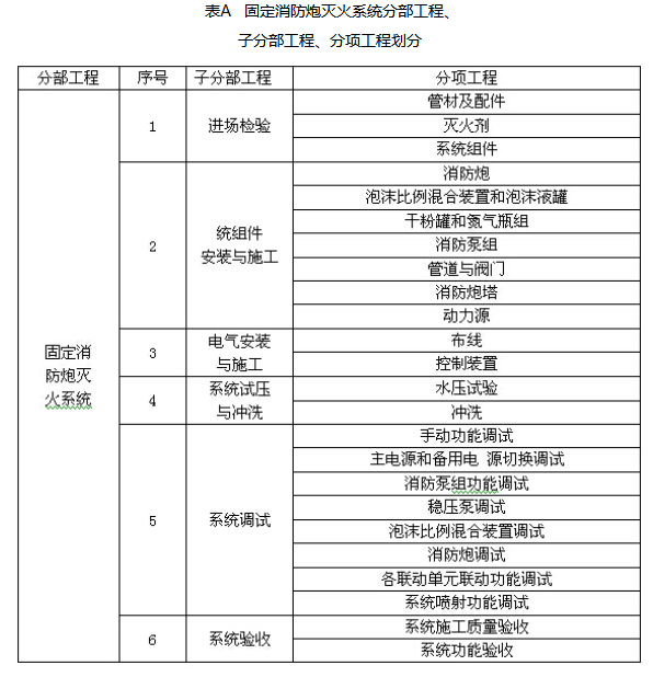 固定消防炮灭火系统分部工程、分部工程、分项工程划分