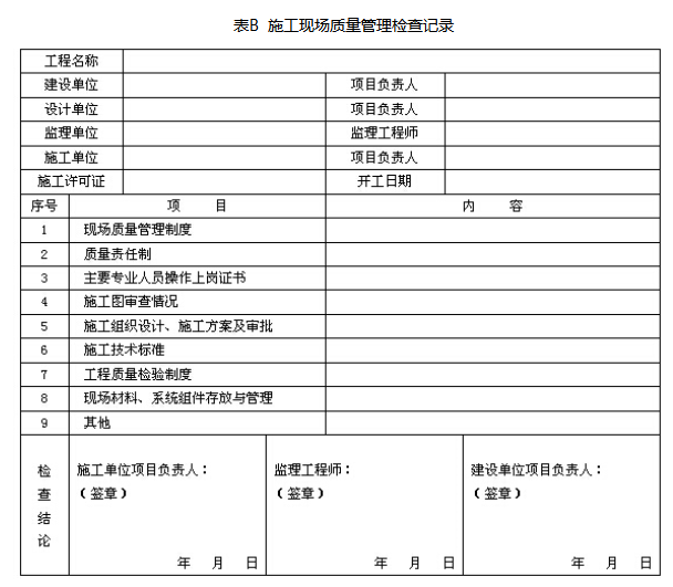 施工现场质量管理检查记录应由施工单位按表B填写,监理工程师和建设单位项目负责人进行检查,并作出检查结论。