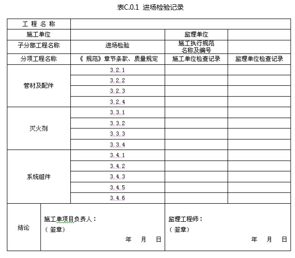 固定消防炮灭火系统施工过程中的进场检验记录应由施工单位质量检查员按表C.0.1填写,监理工程师进行检查,并作出检查结论。