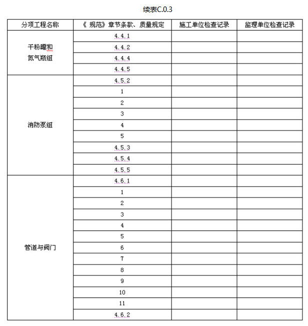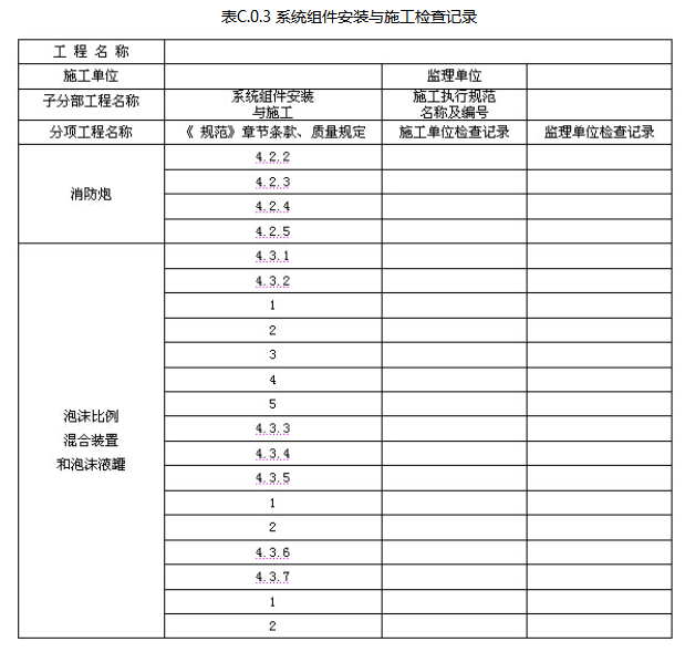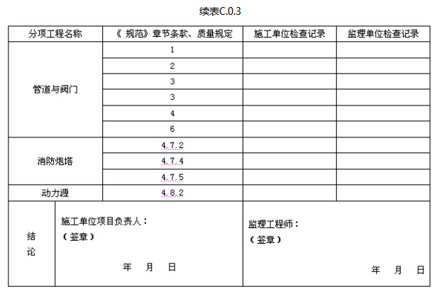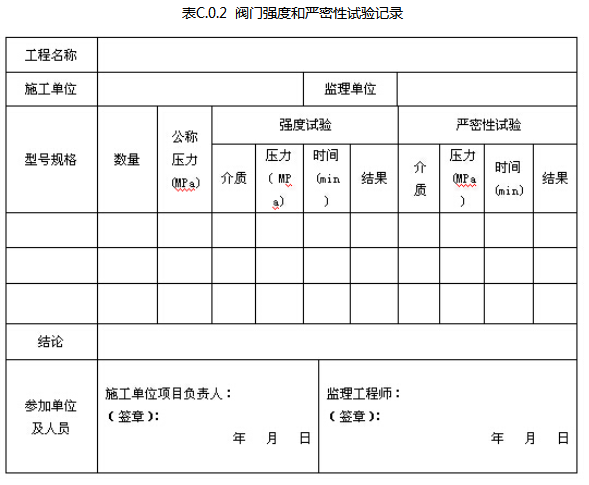 C.0.2 固定消防炮灭火系统的阀门强度和严密性试验记录应由施工单位质量检查员按表C.0.2填写,监理工程师进行检查,并作出检查结论。