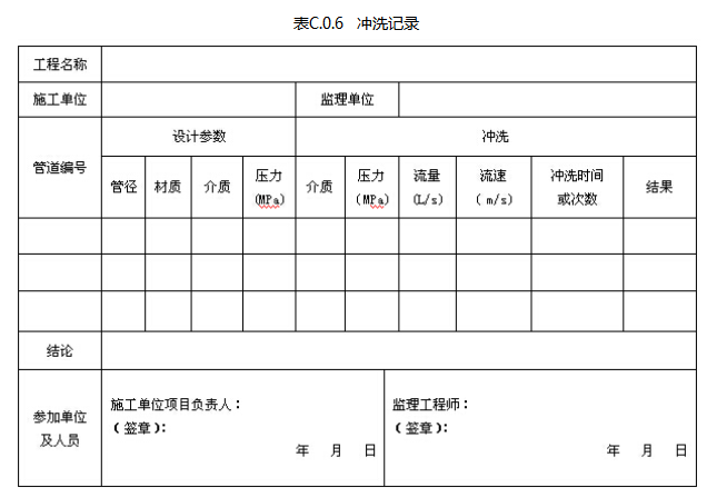 固定消防炮灭火系统的冲洗记录应由施工单位质量检查员按表C.0.6填写,监理工程师进行检查,并作出检查结论。