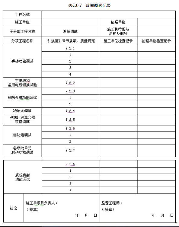 固定消防炮灭火系统的系统调试记录应由施工单位质量检查员按表C.0.7填写,监理工程师进行检查,并作出 检查结论。