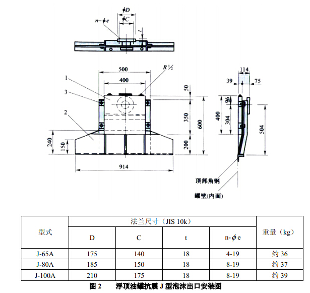 ;日本干化学消防公司的浮顶油罐抗震 J 型泡沫出口安装图,见图2 。它们都与泡沫产生器配套使用,参考时要注意型号。