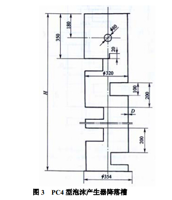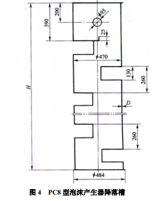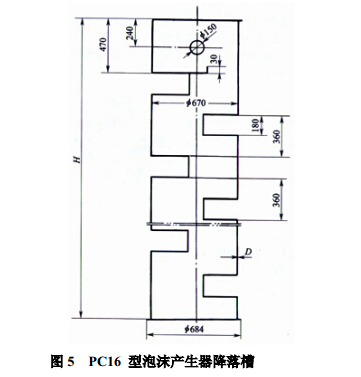 条。泡沫溜槽是在泡沫降落槽之后发展起来的,它的作用与泡沫降落槽相同,这两种形式的泡沫缓冲装置,在设计时可任选一种。它的尺寸是通过计算决定的,泡沫溜槽的横截面积等于或略大于泡沫产生器出口管横截面积与发泡倍数的乘积。在设计未规定时可参照图6