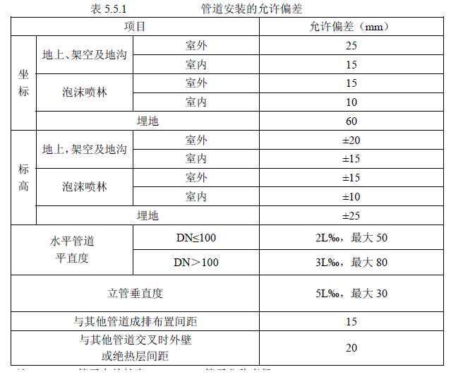 4 原规范第 4.6.1 条的全面修改。本款对管道安装的允许偏差作了规定,见表 5.5.1