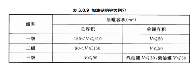 3 基本规定3.0.2 本规范允许加油站与加气(LPG、CNG、LNG)站合建。这样做有利于节省城市用地、有利于经营管理,也有利于燃气汽车的发展。只要采取适当的安全措施,加油站和加气站合建是可以做到安全可靠的。国外燃气汽车发展比较快的国家普遍采用加油站和加气站合建方式。 从对国内外加气站的考察来看,LPG加气站与CNG、LNG加气站联合建站的需求很少,所以本规程没有制定LPG加气站与CNG、LNG加气站联合建站的规定。 电动汽车是国家政策大力推广的新能源汽车,利用加油站、加气站网点建电动汽车充电设施(包括电池更换设施)是一种便捷的方式。参考国外经验,本条规定加油站、加气站可与电动汽车充电设施联合建站。 为使条文更加清晰、明确,本次局部修订修改了本条表述。3.0.3 橇装式加油装置固定在一个基座上,安放在地面,具有体积小、占地少、安装简便的优点。为确保安全,这种橇装式加油装置采取了比埋地油罐更为严格的安全措施,如设置有自动灭火装置、紧急泄压装置、防溢流装置、高温自动断油保护阀、防爆装置等埋地油罐一般不采用的装置,安全性有所保证,但毕竟是地上油罐,不适合在普通场合使用。本条规的"橇装式加油装置可用于政府有关部门许可的企业自用、临时或特定场所","企业自用"是指设在企业的橇装式加油装置不对外界车辆提供加油服务;"临时或特定场所"是指抢险救灾临时加油、城市建成区以外专项工程施工等场所。3.0.8 增加柴油尾气处理液加注业务,是为了适应清洁燃料的发展需要。3.0.9 加油站内油罐容积一般是依其业务量确定。油罐容积越大,其危险性也越大,对周围建、构筑的影响程度也越高。为区别对待不同油罐容积的加油站,本条按油罐总容积大小,将加油站划分为三个等级,以便分别制定安全规定。