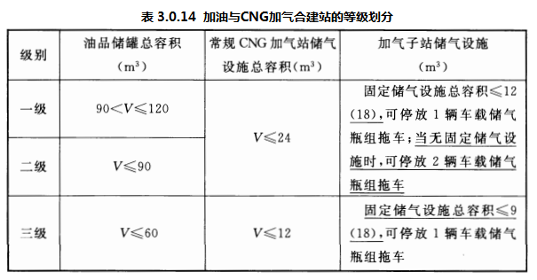 3.0.14 加油与CNG加气合建站的等级划分,应符合表3.0.14 的规定。