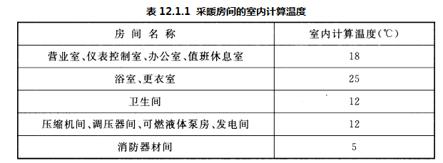 12.1.1 加油加气站内的各类房间应根据站场环境、生产工艺特点和运行管理需要进行采暖设计。采暖房间的室内计算温度不宜低于表12.1.1的规定。