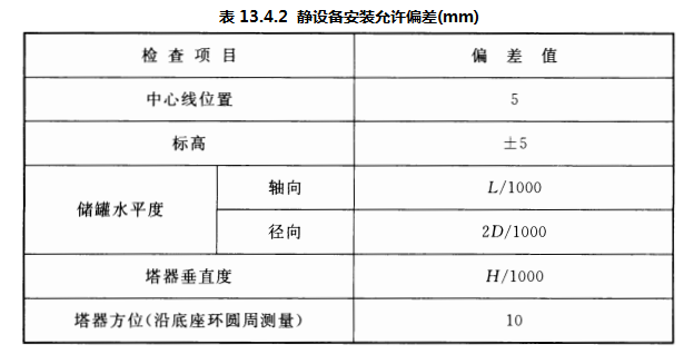 13.4.2 静设备的安装应符合现行国家标准《石油化工静设备安装工程施工质量验收规范))GB50461的有关规定。安装允许偏差应符合表13.4.2的规定。