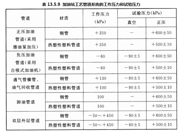 13.5.9 表中热塑性塑料管道系统的工作压力和试验压力值是参照欧洲标准《加油站埋地安装用热塑性和挠性金属管道》EN 14125—2004给出的。