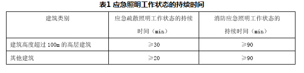 4.11.1.2 切断正常供电电源后,应急工作状态的持续时间不应低于表1规定。