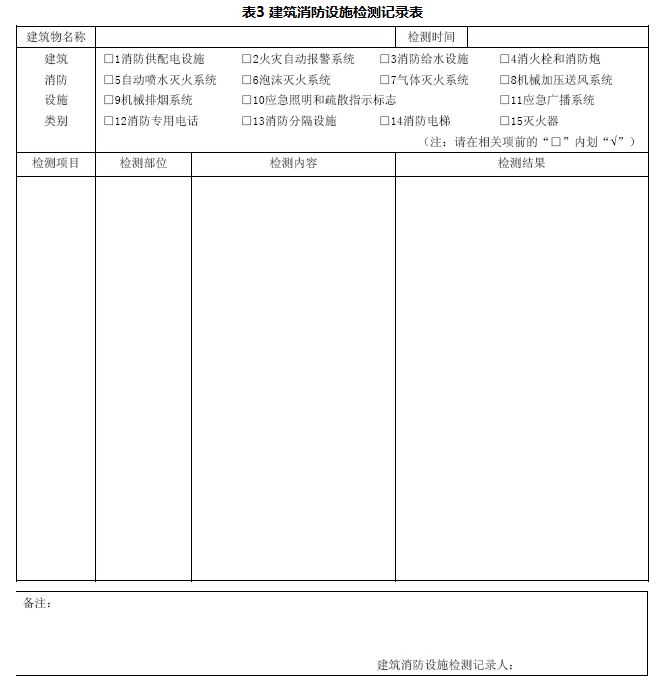 应逐项记录各消防设施的检测结果及仪表显示的数据,填写检测记录表,并与上一次检测的记录表对比。表3给出了检测记录表的基本样式。