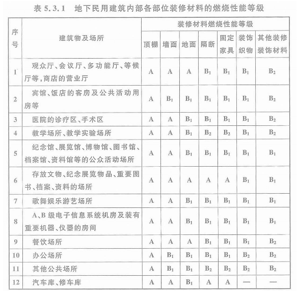 5.3.1 地下民用建筑内部各部位装修材料的燃烧性能等級,不应低于本规范表5.3.1的规定。