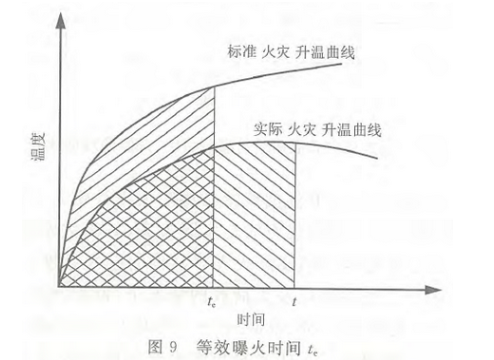 当实际火灾升温曲线不同于标准火灾升温曲线时,钢结构在实际火灾作用下的等效曝火时间te可按实际火灾升温曲线、时间轴、时刻t直线三者所围成的面积与标准火灾升温曲线、时间轴、时刻te直线三者所围成的面积相等的原则经计算确定。