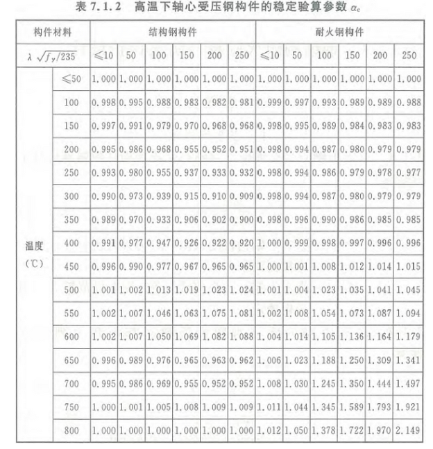 αc——高温下轴心受压钢构件的稳定验算参数,应根据构件长细比和构件温度按表7.1.2确定。
