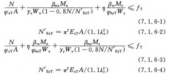 φxT、φyT——高温下轴心受压钢构件对应于强轴和弱轴失稳的稳定系数,应按本规范第7.1.2条式(7.1.2-2)计算;