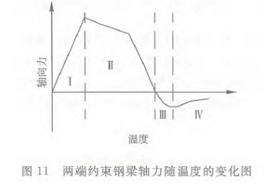 框架梁上一般有楼板或其他支撑,起到侧向约束作用,可防止框架梁发生整体失稳,因此钢框架梁的耐火承载力取决于其截面强度。试验和理论研究发现,对于两端有一定轴向约束的框架梁,火灾下梁的轴力首先为压力,但随着梁挠曲变形的增大,由于悬链线效应,梁中轴压力将逐渐减小,直至为零,再变为拉力。随着轴向拉力的发展,梁仍能再承受较高些的温度才会发生强度破坏(图11)。因此,框架梁的耐火设计,可偏于安全地取梁中温度轴力为零时的状态,进行耐火承载力验算。
