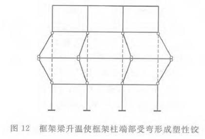 通常,框架柱受火时,相邻框架梁也会受影响而升温膨胀使框架柱受弯。分析表明,框架柱很可能因框架梁的受火温度效应而受弯形成塑性铰。为简化框架柱耐火设计,可偏于保守地假设柱两端屈服(图12),同时忽略框架柱另一方向弯矩的影响,则本规范第7.1.6条有关框架柱平面内、外稳定验算公式(7.1.6-1)、(7.1.6-3)可分别近似为: