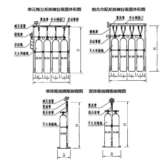 说明:IG-541气体灭火系统储存装置外形图依据广东平安消防设备有限公司提供的技术资料绘制。其他企业装置外形可能略有差别,但其基本功能是一致的。