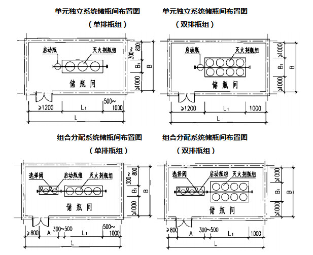 5.如系统较大,灭火剂储瓶较多,可采用灭火剂储存装置两行布置方式,装置两操作面之间的距离不宜小于1.0m。