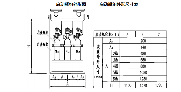 2.图中A为启动瓶架长度尺寸,详见右上图及表;L1、B1为灭火剂储存装置长度及宽度尺寸,详见本图集总说明、外贮压式七氟丙烷灭火系统说明、高压二氧化碳灭火系统说明、三氟甲烷灭火系统说明。