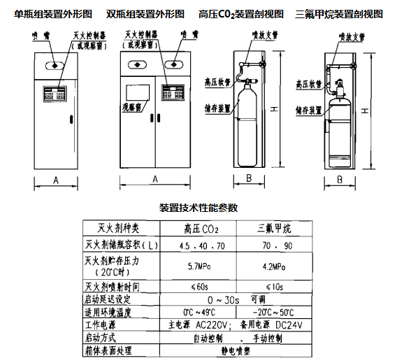 2.南京消防器材股份有限公司生产的柜式三氟甲烷灭火装置采用氮气(N2)驱动,驱动瓶容积0.4L,驱动气体充装压力6MPa。