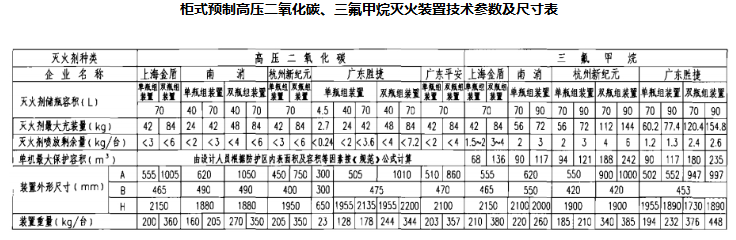 注:1.表中三氟甲烷预制装置单机最大保护容积是指灭火设计浓度为16.2%时的防护区容积。