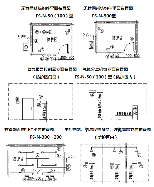①空气压缩机组;②分子筛法制氮气体分离机组;③膜法制氮气体分离机组;④主控制器;⑤氧浓度探测器;⑥紧急报警控制器;⑦注氮管路;⑧注氮喷嘴;⑨防护区采用注氮控氧防火系统警示标牌;⑩系统氧浓度设定值标牌。