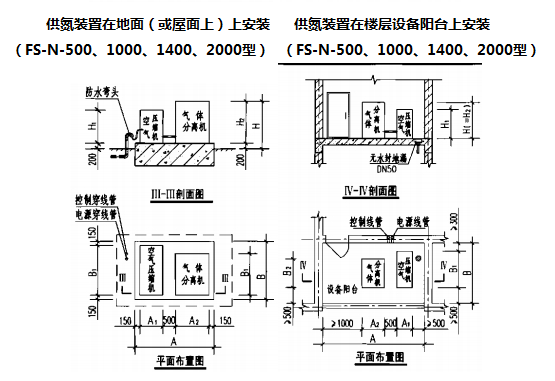 说明:1.供氮装置安装在专用设备间时,设计人员可参照设备阳台安装尺寸进行布置,机组与墙面的距离宜适当放大。