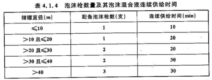 4.1.4 设置固定式泡沫灭火系统的储罐区,应配置用于扑救液体流散火灾的辅助泡沫枪,泡沫枪的数量及其泡沫混合液连续供给时间不应小于表4.1.4的规定。每支辅助泡沫枪的泡沫混合液流量不应小于240L/min。