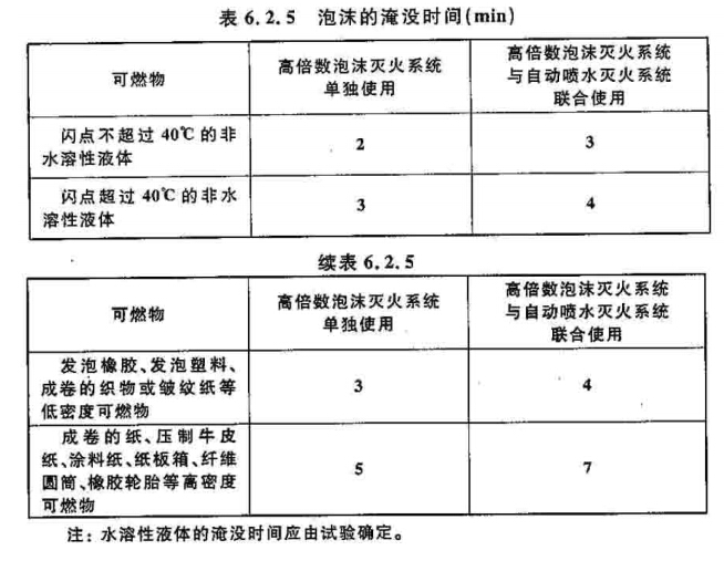 6.2.5 泡沫的淹没时间不应超过表6.2.5的规定。系统自接到火灾信号至开始喷放泡沫的延时不应超过1min。