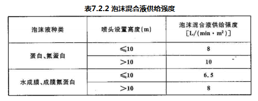 7.2.2 本条是在总结国内灭火试验数据的基础上,参照NFPA16《泡沫-水喷淋系统与泡沫-水喷雾系统安装标准》、BS 5306 Part 6《泡沫灭火系统标准》,并结合我国国情制定的。本条规定必须做到,否则灭火无法保证,为此定为强制性条文。
