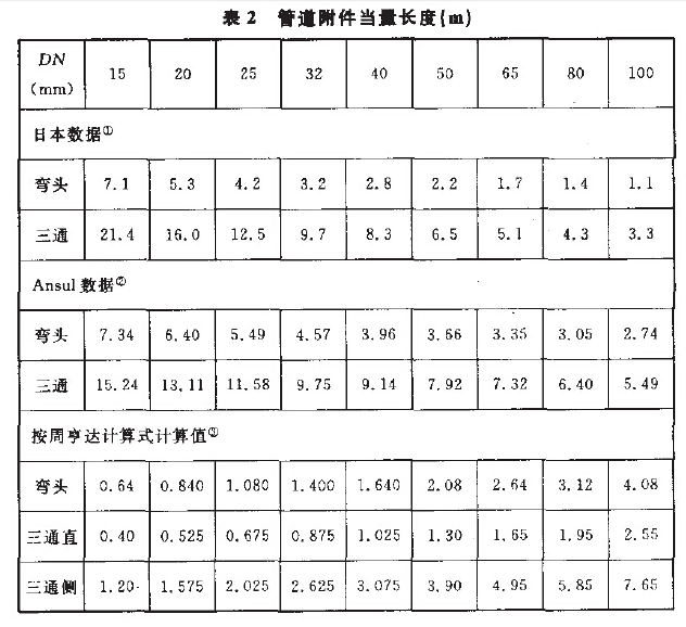 4.0.5 关于管道附件的当量长度,应该按厂家给出的实测当量长度值取值,但目前实际还做不到,不给出数据又无法设计计算。按周亨达给出的管道附件的当量长度计算式为:Lj= k×d,其中k是当量长度系数(m/mm):90°弯头取0.040,三通的直通部分取0.025,三通的侧通部分取0.075。下面一同给出国外管道附件当量长度数据做比较(见表2):