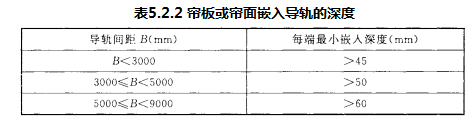 1 防火卷帘帘板或帘面嵌入导轨的深度应符合表5.2.2的规定。导轨间距大于表5.2.2的规定时,导轨间距每增加1000mm,每端嵌入深度应增加10mm,且卷帘安装后不应变形。