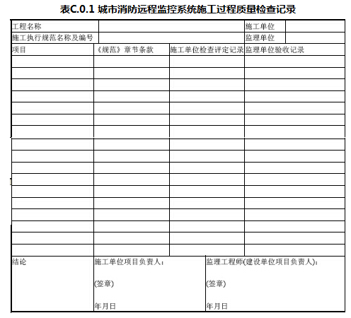 C.0.1城市消防远程监控系统施工过程质量检查记录应由施工单位质量检查员按表C.0.1填写,监理工程师进行检查,并作出检查结论。