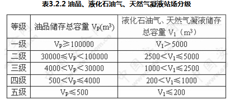 3.2.2 石油天然气站场的分级,根据原油,天然气生产规模和储存油品、液化石油气、天然气凝液的储罐容量大小而定。因为储罐容量大小不同,发生火灾后,爆炸威力、热辐射强度,波及的范围、动用的消防力量,造成的经济损失大小差别很大。因此,油气站场的分级,从宏观上说,根据油品储罐、液化石油气和天然气凝液储罐总容量来确定等级是合适的。